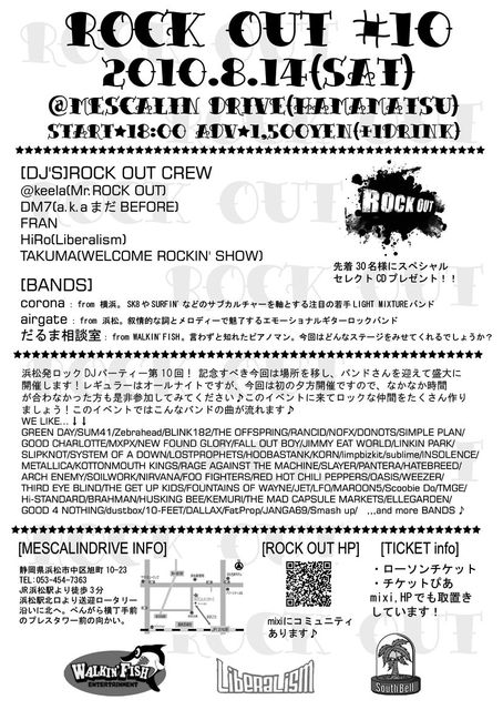 告知失礼致します。 浜松市で偶数月に開催している ロックDJパーティー “ROCK OUT”でございます。 このたびは第10回記念として、 通常のオールナイトイベントではなく、 バンドさんを招いて夕方開催をいたします。 オールナイトなので、なかなか参加できなかった方もこの機会に 是非遊びませんか!?!? ゲストバンドとして、 横浜より、若手注目株のLIGHT MIXTUREバンド”corona” 浜松より、エモーショナルなギターロックで魅了する”airgate” 浜松WALKIN’ FISHより、言わず