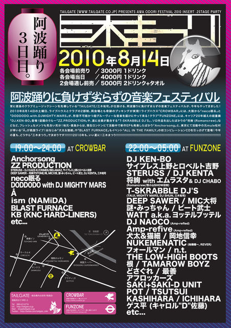 管理人様貴重なスペース失礼いたします。 不適切な場合お手数ですが削除お願いいたします。 ---------- 〜TAILGATE Presents〜 三木まつり 2010 ---------- 開催日 / 2010年8月14日 (阿波踊り3日目) 19時〜24時 / CROWBAR 徳島市銀座16-1 東山ビル1F 22時〜翌5時 / FUNZONE 徳島市秋田町1-50 アクティ異人館ビルB1F ---------- 各会場前売り / 3000円 1ドリンク 各会場当日 / 4000円 1ドリンク 2会場通し前売り / 5000円 2ドリンク+タオル ---------- 常に徳島のクラブミュージックシーンを先導している「TAILGATE/