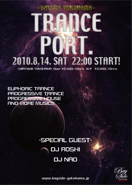 2010. 08. 14. Sat @BAY SIDE Yokohama Euphoric Trance, Progressive Trance, Progressive House, Tech House and more Music!!! 2010年8月14日土曜日、BAY SIDE Yokohama, MAGICにて本場ヨーロッパTRANCE PARTY『TRANCE PORT.』を開催!!! Guest DJにはTrance Musicのの原点から現在まで見てきた男、DJ ROSHIが登場!!!2002年にはfarm RecordsよりMIX CD 『SPLASH』をリリースし、ブーム初期からぶれる事無く、ひたすら王道トランスを回している貴重な存在である。 そしてもう一人はCUTEなルックスと独自の音楽性でオーディエンスをわかせてい