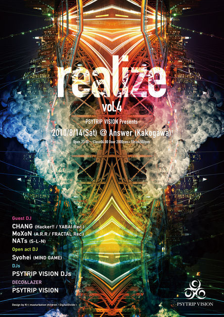 管理人さん告知失礼します!! 【REALISE VOL.4】 PSYTRIP VISION Presents Day 2010/8/14(Sat) Open 23:00〜Close06:00 Place Answer (Kakogawa) Door 2000yen+500yen(1Drink) 【Guest DJ】 CHANG (Hacker!! / YABAI Rec.) MoXoN(A.R.R / FRACTAL Rec.) NATs(S-L-N) 【Open act DJ】 Syohei (MIND GAME) 【DJs】 PSYTRIP VISION DJs 【DECO&LAZER】 PSYTRIP VISION ■アルコール類、危険物、薬物及び法律で禁止されている物の持ち込み、ケンカ等問題が発生した場合 、理由の有無に関わらず警察に通報し