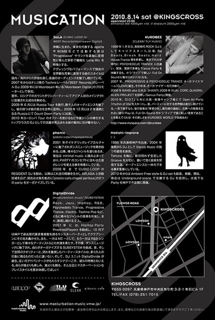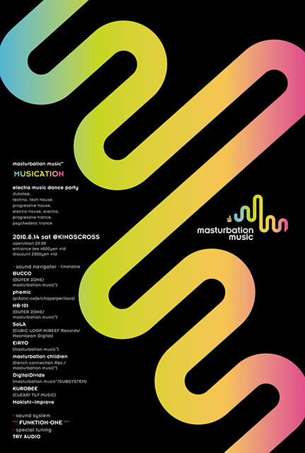 KOBEから発信♪ masturbation music"が自信を持ってお届けするspecialなDJ&音のstory☆☆☆DanceMusicの持つ素晴らしくpositiveな力を共にlongtimeで体感しましょう♪ 一晩で…様々なGenreを経て…partyとゆう名の一枚のrecordを創りあげます♪♪♪ 皆様と共に良き時間を過ごせますように love&peace…make your smile!!! ***masturbation music" presents*** ♪MUSICATION♪ electro music dance party "dubstep, techno, tech house, progressive house, electro house, electro, progress