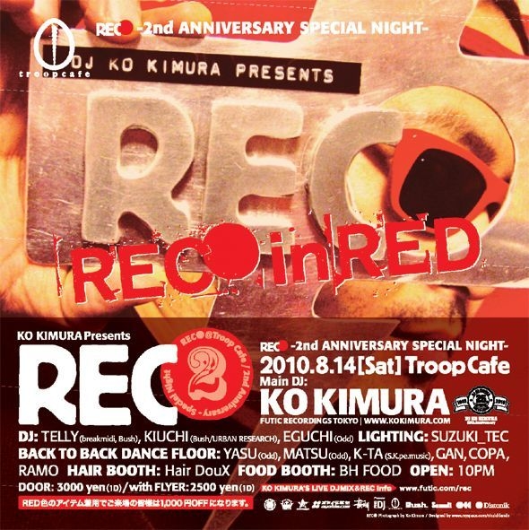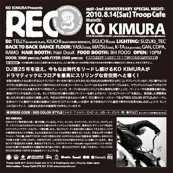 管理人様告知失礼します。 8.14(SAT) KO KIMURA presents REC● -2nd ANNIVERSARY SPECIAL NIGHT- @Troopcafe http://troopcafe.iflyer.jp/venue/flyer/61885 TIME:22:00 ~ LATE GENRE:House,Tech House,Techno ARTISTS:KO KIMURA, DJ TELLY(breakmidi), KIUCHI, EGUCHI 絶えず時代の先端を見据えながらカッティングエッジな選曲と卓越したスキルでプロとして25年DJし続けてきたKO KIMURA。そのKO KIMURAのホームグラウンドとなるレジデントパーティーがREC●だ。技術の進歩とともに変化するDJテクノロジーをいち早く取り入れてき