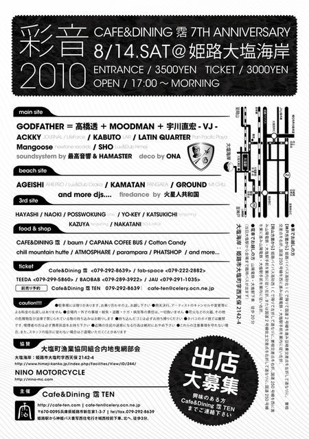 姫路の夏の風物詩ビーチパーティーが今年もお盆に開催です!!! 【彩音 psy-on 2010 cafe&dining 霑 7th anniversary】 8/14(SAT)@姫路大塩海岸 17:00 START〜TILL MORNING ENTRANCE / 3500yen TICKET / 3000 yen <MAIN FLOOR> GODFATHER 高橋 透(GODFATHER/SMOKER) MOODMAN(GODFATHER/HOUSE OF LIQUID/SLOWMOTION) 宇川 直宏・VJ(GODFATHER/DOMMUNE) http://www.dommune.com/ http://www.luvdub.jp/godfather/home.html ACKKY(JOURNAL / LifeForce) http://ackkyjournal.cx/ KABUTO(LAIR)