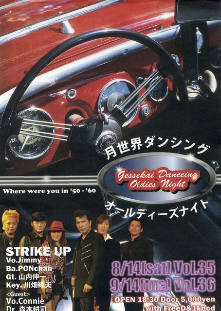 管理人様 貴重なスペースをお借りして申し訳ありません。 ふさわしくない内容が含まれておりましたら削除お願いします。 神戸の元キャバレー”クラブ月世界”昭和の匂い漂うゴージャスな空間とダンスフロアーで踊りませんか? 大好評月一回の開催です。 ABCの番組や新聞各社でも取材いただいた月世界の名物イベントの一つです。 ”月世界ダンシングオールディーズナイト” イベントを盛り上げるとっておきのバンドはSTRIKE UP 普段はプロミュージシャンのバックで演奏をされているほどのバンドマンたちで結成されたバンドで