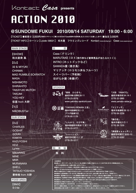 告知失礼いたします。 ■ACTION 2010 Kontact & Casa presents http://www.kontact.jp/ http://www.casamusic.jp/ @SUNDOME FUKUI (サンドーム福井) 〒915-0096 福井県越前市瓜生町5-1-1 http://www.sankan.jp/sundomegaiyou.html 2010 8/14 (sat) OPEN 19:00 - 6:00 [前売りチケット 3000円] (前売りチケットご購入の方のみ Casa6周年の招待券 を入り口にてプレゼントいたします)