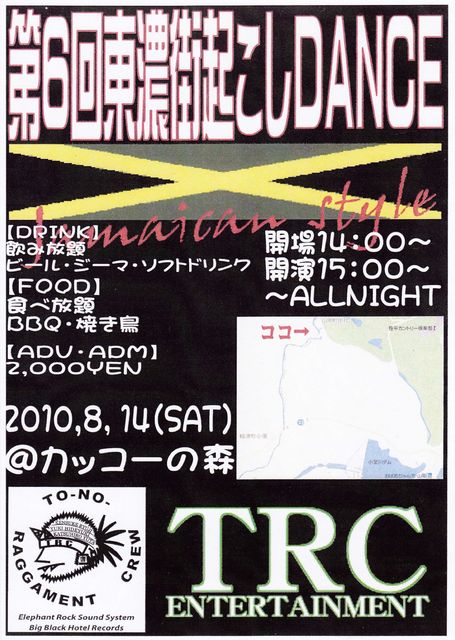 お待たせ致しました ついにやって参りましたお盆スペシャル TRCpresents『第6回東濃街起こしダンス』 前回とは内容が違いますので長いけど最後まで読んでください 【日時】8月14日(土曜)14:00〜開場 15:00〜開演〜ALLNIGHT 【場所】カッコーの森@特設ステージ(稲津町)[道の駅おばあちゃん市より北に約300m] ※PC用の地図のリンクで確認できます!(拡大、縮小で確認して下さい) http://map.yahoo.co.jp/pl?type=scroll&lat=35.33