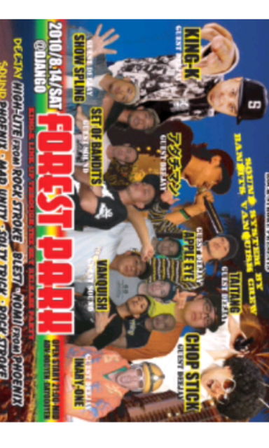 8/14岐阜県中津川市 『FOREST PARK』 KING-K 1stALBUM 〜LINK UP THROUGH THE SKY〜リリースパーティ 21:00〜5:00 前売り2000円当日3000円 @岐阜県中津川市千旦林広沢177-14 DJANGO (中津川ICスグ) ☆SPECIAL GUEST KING-K、CHOP STICK fromDrProduction ☆GUEST Deejay アダチマンfrom東京、TAITANGfrom東京 inary-onefrom長野、APPLE EYEfrom長野、SHOW SPRINGfrom長野 ☆GUEST SOUND VANQUISHfrom長野 *SET OF BANDITSは都合により出演不可 日記等で情報Upしています 気軽にメッセージ下さい ワールト