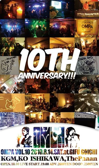 今回でOMPAは10回目を迎えます。 1回1回のその特別な日に、一緒に楽しんでくれた沢山の皆様有難うございます! 節目となる8/14の10回目には、KGM、石川コウ、ThePaaanの3組の出演が決定しました! 会場は岐阜県庁近くの"岐阜51"。アクセスもしやすく、皆さんを迎えるのに不安も不満も無い、とっても素敵な会場です。 8/14は是非、OMPA VOL.10へ遊びに来てください。 ご来場心よりお待ちしています! 2010.8.14.SAT.at.岐阜51 OFFICE SAUNTER PRESENTS "OMPA VOLUME10" OPEN&MUSIC START.18:00 / LIVE START.19:00 ADV.2000YEN / DOOR.