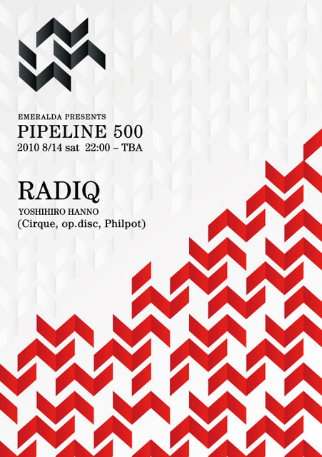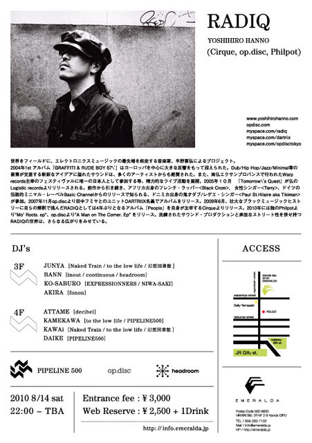 管理人様、告知失礼します。 ::::: EMERALDA :::::::::::::::::::::::::::::::::::::::::: http://emeralda.jp 岐阜市神田町2-8 ヒカリビル3F/4F tel/058-263-7132 E-mail info@emeralda.jp ::::::::::::::::::::::::::::::::::::::::::::::::::::::::::::::::: 8/14(sat) PIPELINE500 22:00 - TBA charge / オンライン予約\2,500 w/1D http://info.emeralda.jp/?page_id=13 当日\3,000 GUEST LIVE RADIQ a.k.a 半野喜弘(Cirque, op.disc, Philpot) DJs ATTAME JUNYA (to the Low life