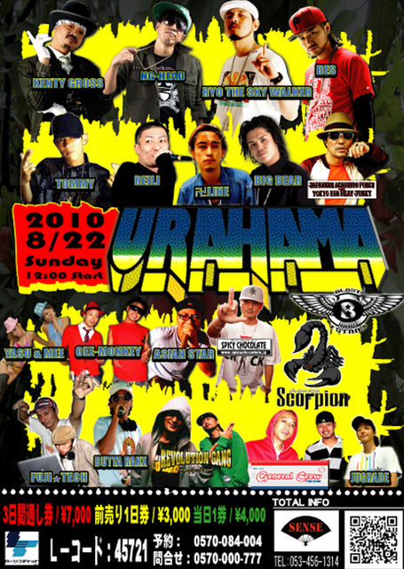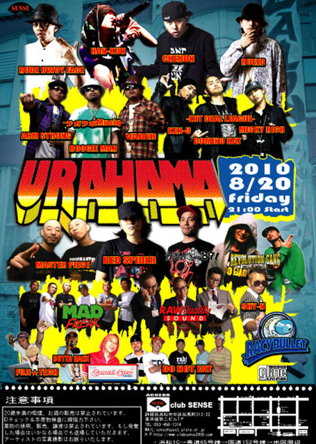 管理人様 告知失礼致します。 URAHAMA ■開催日,場所 2010年8月20〜22日@CLUB SENSE ■料金 〜前売り〜 3日通し券 : \7.000 1日券 : \3,000 〜当日〜 当日日券 : \4,000 ■LAWSONチケット L-コード :45721 予約 :0570-084-004 問い合せ :0570-000-777 ■イベント詳細 ○8/20(REGGAE) Start 21:00 〜SPECIAL GUEST LIVE〜 HUN-KUN , CHEHON , ENT DEAL LEAGUE(KEN-U , MICKY RICH , DOMINO-KAT) ラガラボMusiq(BOOGIE MAN , ARM STRONG , VADER) , RUDEBWOY FACE RUEED , 〜SPECIAL GUEST SOUND〜