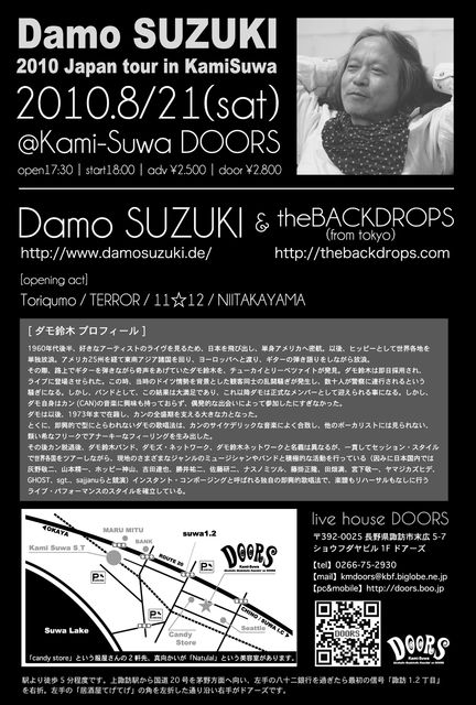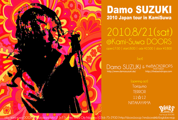 先日ドイツより日本に上陸したばかりの「ダモ鈴木(ex:CAN)」が明後日21日(土)に長野県は上諏訪ドアーズに登場! ★8/21(土) [ダモ鈴木 JAPAN TOUR IN 上諏訪]★ @上諏訪ドアーズ OPEN17:30 START18:00 adv2.000円/door2.500円 <GUEST> ダモ鈴木(ex:CAN) the BACKDROPS <ACT> テロル / Toriqumo / 11☆12 / ニイタカヤマ 70年代初頭ドイツにてカリスマ的な異彩を放っていた 伝説のバンド『CAN』のヴォーカリスト『ダモ鈴木』上諏訪上陸!! theBACKDROPS(東京)をバックバンドに奇跡のグルーヴィンナイト! <↓チケット予約受付中