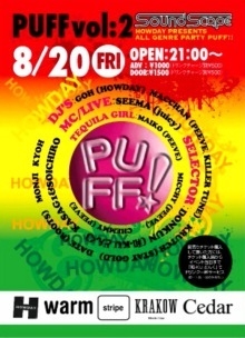 PUFF!! vol.2 10.08.20 (FRI) @ Sound Scape open: 21:00 〜 ADV:\1000 (ドリンクチャージ別\500) DOOR:\1500 (ドリンクチャージ別\500) DJ'S GOH(HOWDAY) MACCHAN(PEEVE) KRUTCH(STAY GOLD) DATE(ROOTS) MONJI KYOH MC/LIVE SEEMA (THE BLACKISH/Juicy) SELECTOR DONKUN (和-KU どんく) KASAG1&SOICHIRO TEQUILA GIRL CHEMMY (PEEVE) MICCHY (PEEVE) MAIKO (PEEVE) *前売りチケット購入して頂いた方には、チケット購入時からイベント当日まで和-KU どんくでドリンク一杯サービス‼ PUFFまで残り2日! 当