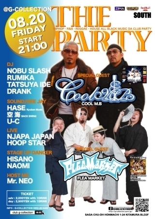フリマが久々の佐賀ライブ!! お近くの方は是非!! “THE PARTY” @ G-COLLECTION ●開演時間 : 21:00〜 ●前売料金 : 2,000円 当日料金 : 2,500円 ※ ドリンク代含 ● お問い合わせ先 : G-COLLECTION 0952-40-0460 ■SP GUEST ・COOL M.B ・FLEA MARKET ■DJ ・NOB SLASH ・RUMIKA ・TATSUYA IDE ・DRANK ■SOUND/DEE JAY ・HAHE(KYUKON MUSIC) ・空海(BACK SWING) ・U-C ■LIVE ・NJAPA JAPAN ・HOOP STAR ■STAGE UP DANCER ・