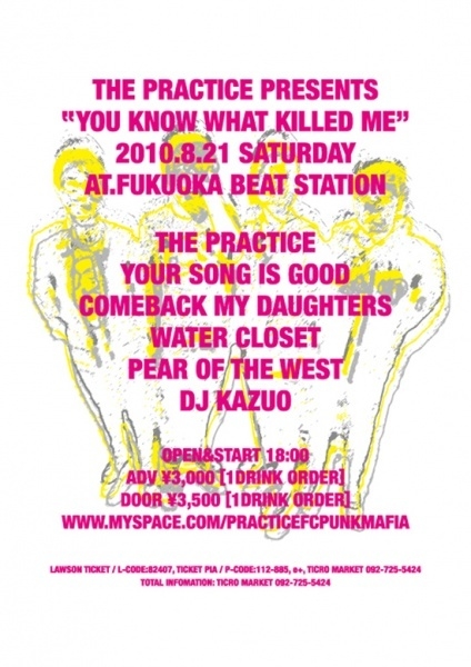 昨年の新代田FEVERの再現か!?THE PRACTICEの復活ライブのために駆けつけるYOUR SONG IS GOOD、COMEBACK MY DAUGHTERS、WATER CLOSETという豪華メンツに、福岡からは男女混声VOでコアなファンも多いPEAR OF THE WEST、DJ KAZUOという、キッズもコアなパンク好きも唸らせる伝説の一夜が現実に!