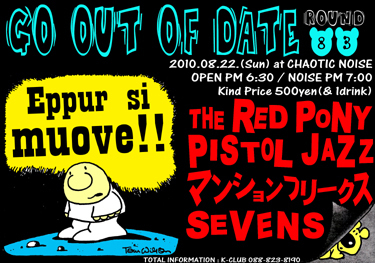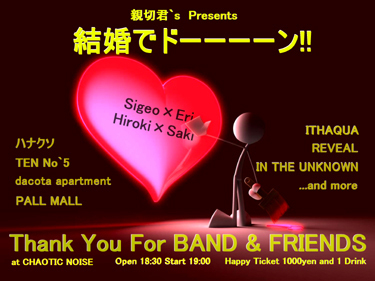 今週末一本目8月21日(土)は、シゲオ(INTHEUNKNOWN)とオペラ嬢(REVEAL、足袋猫)、更にマタヤン(REVEAL)とその彼女の結婚をバンド仲間で祝うその名も「結婚でドーーーーン!!」!! (↓)詳細はこちら ● 08月21日(土) 親切君企画 「結婚おめでドーーーーン!!」 PM 6:30 OPEN / PM 7:00 NOISE : ADV & DAY 1000円 Feat : IN THE UNKNOWN / REVEAL / PALL MALL / dacota apartment / ハナクソ / TEN-No.5 / ITHAQUA .....and more!! 続く二本目8月22日(土)は高知のバンドによる、ジャンルレスガッチンコバットル「GO OUT OF DATE round.83」!!
