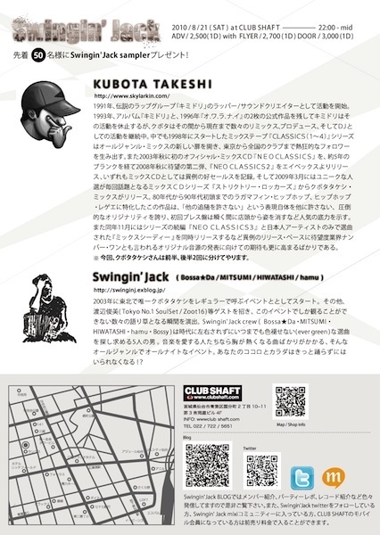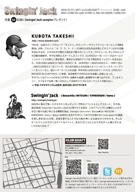 管理人様、告知失礼します。 今回のクボタさんは『2セット』です! 【ALLMIX PARTY】 Swingin 'Jack 2010/8/21(Sat)@CLUB SHAFT START 22:00〜mid Ticket ADV/2500(1D)with FLYER/2700(1D)DOOR/3000(1D) 【SPECIAL GUEST DJ】 クボタ タケシ 【DJ】 Bossa★Da MITSUMI HIWATASHI hamu Bossy 【VJ】 N-65 organization ※先着50名様にSwingin ' Jack Samplerプレゼント! ※シャフトのモバイル会員の方、キャッシャーで提示して頂ければ1ドリンクのところ2ドリンクサービス! CLUB SHAFT 宮城県仙台市青