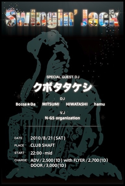 レギュラーでクボタさんを招いているSwingin 'Jack。 今回のクボタさんは、2セットのプレイになります! メンバー一同お待ちしてます。 ↓↓↓↓↓↓↓↓ 【ALLMIX PARTY】 Swingin ' Jack 2010/8/21(Sat)@CLUB SHAFT START 22:00〜mid Ticket ADV/2500(1D)with FLYER/2700(1D)DOOR/3000(1D) 【SPECIAL GUEST DJ】 クボタ タケシ 【DJ】 Bossa★Da MITSUMI HIWATASHI hamu Bossy 【VJ】 N-65 organization ※先着50名様にSwingin ' Jack Samplerプレゼント! ※シャフトのモバイル会員の方、キャッシャーで提示