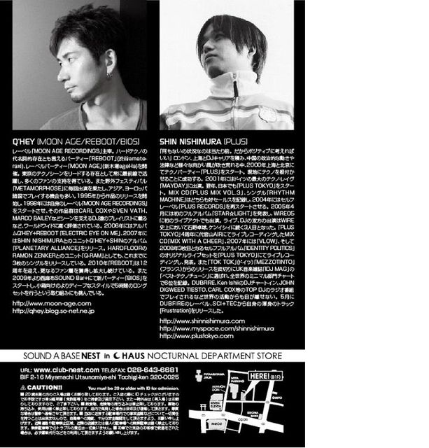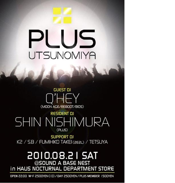 PLUS UTSUNOMIYA ■DATE/2010.8.21(SAT) ■OPEN/22:00- ■VENUES/SOUND BASE A NEST in HAUS ■Add/栃木県宇都宮市宮町2−16宮町ビルB1 ■Fee/DAY¥2500,W/F¥2500(1drink),PLUS MEMBER¥1500 ■SPECIAL GUEST/ Q-HEY http://www.moon-age.com http://qhey.blog.so-net.ne.jp ■RESIDENT DJ/ SHIN NISHIMURA http://www.shinnishimura.com http://www.plustokyo.com ■SUPPORT DJ/ K2,S.B,FUMIHIKO TAKEI aka A-TECH,TETSUYA ■MORE info/ 028-643-6681 http://www.club-nest.com ■アクセス/ J