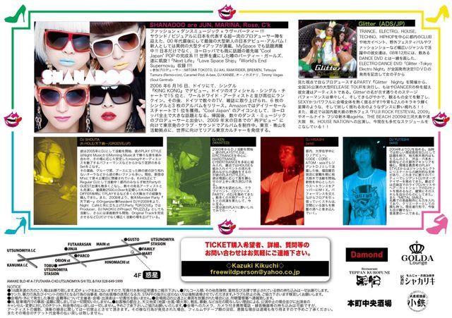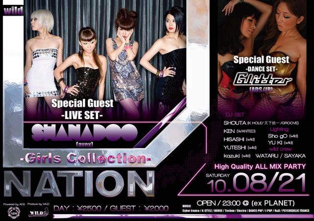 世界を虜にした噂の パーティー・ガールズ 『SHANADOO』 出演決定!!! The first appearance by Utsunomiya 待望のU-NATIONが この夏に開幕する!!! wild Present's =U−NATION= 〜Girls Collection〜 日付:2010/08/21(Sat) 場所:Club@PLANET 宇都宮 時間:PM 23:00 START 料金:DAY \2500 ・guest \2000 〜music〜 TRANCE/HOUSE/J-POP/R&B Techno/Electro/DANCE-POP ★Special Guest★ ◇LIVE SET◇ SAHNADOO(avex) ◇DANCE SET◇ Glitter(ADS/JP) ■DJ