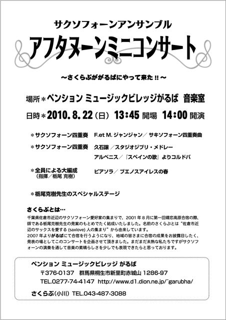 2010年8月22日(日) ペンション ミュージックビレッジ がるば 14:00開演 サクソフォーン愛好家の集まり『さくらぶ』の夏合宿最終日のミニコンサートで演奏します ※入場無料 がるばHP http://www.d1.dion.ne.jp/~garubha/index2.html くわしくはさくらぶのホームページをご覧下さい。 http://sakurabu.jimdo.com/