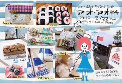 手作りZAKKA作家のアオイロブルーsanが主催するイベント 『aoiroblue EVENT SHOP アオ・アオ#4 』 に、ヒノデカニ商店sanがゲスト出店(初出店)するそうです 【日時】H22年8月22日(日)*11:00〜17:00 【場所】群馬県前橋市南町3-35-3 ライフアップスクエア・アイズ(1Fインナーガーデン) http://eyesweb.jp/ 沢山の手作り作家sanが出店