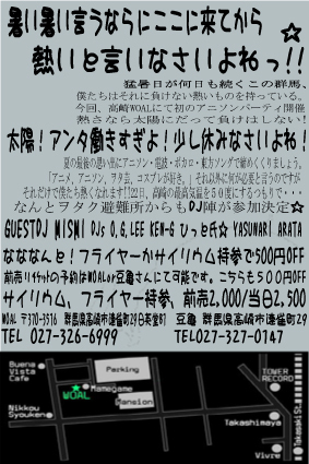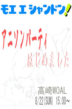 管理人様、貴重なスペースとみなさまと一緒に楽しみたい気持ちで書かせていただきます。 この度、群馬は高崎でアニソン・ボカロ・電波・東方イベントを行います!! ついに!ついについに!大好きなアニソンイベントをはじめられるのですでにわくわくしております。 以下詳細になります。 ↓↓↓ 「モエ・エ・シャンドンVol1」 TakasakiWOAL@高崎 8/22(SUN) OPEN;15;00 withフライヤー、サイリウム、フライヤー画面提示のどれかで500円OFFの2000円/1ドリンク(入り口でご提示下さい。) 当日2500円/