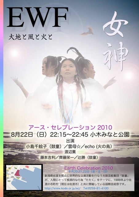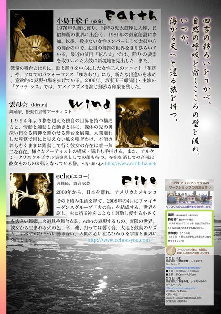 EARTH 大地の女神 WIND 風の女神 FIRE 火の女神 鼓童の小島千絵子が巡り会った二人の舞姫 きらら☆、echo 三人の女神たちが 「地球の祝祭 アースセレブレーション」 に舞い降りる。