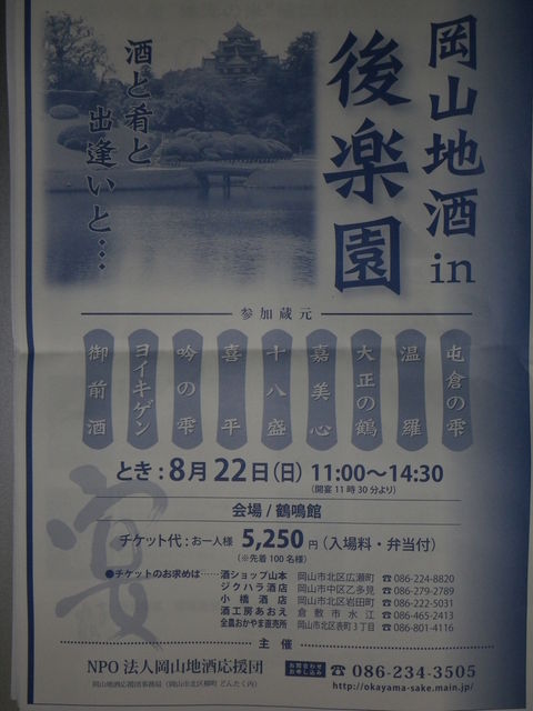 昨年も開催されて好評をいただいた「岡山地酒 in 後楽園」、今年もやります。 美味しいおつまみ弁当と入場料が込み、その上蔵元と楽しいお話をしながら、また目に鮮やかな芝生などの景色を眺めながらお酒が楽しめるんですから、お酒好きにはたまりません! 御前酒・ヨイキゲン・吟の雫・喜平・十八盛・嘉美心・大正の鶴・温羅・屯倉の雫 の各蔵元およびPBが参加します。 日時:8月22日(日) 11:00受付開始〜14:30終宴。 会費:お一人様5250円(先着100名。後楽園入園料込み) チケットのお求めは 応援団事務局(どんたく) 山本酒店 小