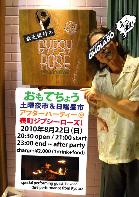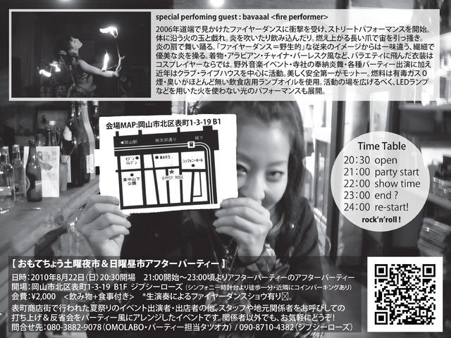 表町商店街にて行われた夏祭りイベントの出演者・出店者の他、 スタッフや地元関係者など全員を巻き込んだ 『 打ち上げ&反省会 』 を イベント風にアレンジしたパーティーです。 関係者以外でもお気軽にどうぞ! 【おもてちょう土曜夜市&日曜昼市 アフターパーティー】 日時:2010年8月22日(日曜日) 20:30 open 21:00 start ~ 23:00 end → after party 会場:岡山市北区表町1-3-19 B1 ジプシーローズ (シンフォニー時計台より徒歩1分・近隣にコインパーキングあり) http://g.ccge.jp/gypsyros