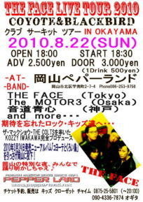[CYOTE&BLACK BIRD] ◆2010年8月22日(日)岡山 ペパーランド 岡山県岡山市北区学南町2-7-4 086-253-9758 http://www.pepperland.net/ -BAND- ・THE FACE (東京) ・THE MOTOR 3 (大阪) ・音道 青心 (神戸) 他 OPEN 18:00 START 18:30 前売/ 2,500円 当日/ 3,000円 ※共に要+1Drink 500円