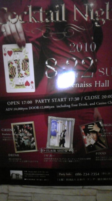管理人様、告知失礼致します。 8月22日!カクテルナイト! バーテンダー協会岡山支部の「ステラベリーHIBIKI」です。 当支部のカクテルパーティーが8月22日に開催されます! 今年は昨年の反省点を踏まえ、 カクテルやウイスキーの種類も増え、 より「大人の遊び場」になります! 今回はお客様の数を少なめに設定します。 チケットは、お早めに。 岡山を代表するバーテンダーたちの数々のカクテルや、 2008年フレアバーテンディング日本チャンピオンの 『下村真一』氏によるフレアショーなど、珠玉のカクテルが目白押
