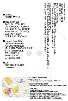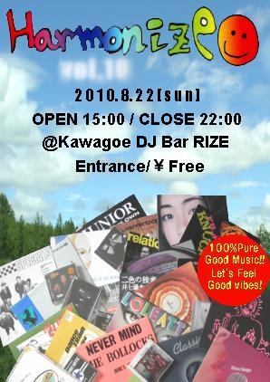 管理人様、告知失礼致します。 不適切な場合は削除願います。 ■TITLE Harmonize vol.10 [Mixi]http://mixi.jp/view_community.pl?id=1963447 ■DATE 2010/8/22(Sun) ■TIME 15:00-22:00 ■ENTRANCE 入場無料!エントランスフリー (All Drink ¥500- / 1drink) ■VENUE DJ Bar RIZE (埼玉県川越市) ■GENRE HOUSE/TECHNO/DISCO/UK ROCK/Drum'n Bass/HIP HOP/JAZZ etc... ■DJs <5F MAIN FLOOR> [GUEST DJs] ke!ta maeda(movin' on up) [Featring DJ] Cotetsu The Small Pizza (R