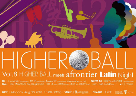 Higher Ball meets afrontier Latin Night 2010年8月23日(月) 18:00〜23:00 Charge Free!! 「ANTHEMBLE by My Humble House」 東京都千代田区丸の内2-6-1 丸の内パークビル Marunouchi BRICK SQUARE 3F 03-5220-1923 人気クラブジャズイベント、afrontierとのコラボレーションイベント第二弾! 今回は、ラテン、サルサ、アフロキューバンをテーマに、怒涛のリズムで丸の内の真夏の夜を熱く湧かせる!」 豪快なブロウが定評のサックス奏者Issei Masatomiが2010年新たに結成した「Soul Bag Union」が出演!ゲストにDJに、松岡"matzz"高廣(q