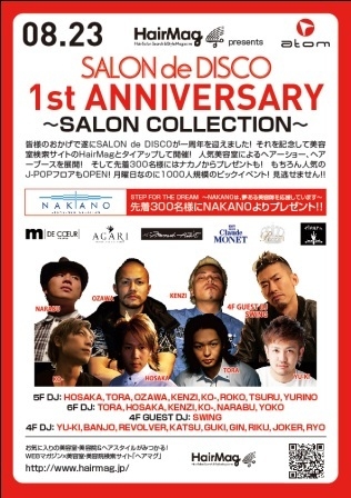 遂にSALON de DISCOが一周年を迎えます! それを記念して美容室検索サイト「ヘアマグ」とタイアップして開催決定! 人気美容室のヘアーショー、ヘアーブースも展開! 更に先着300名様には美容室での指示No.1のナカノワックスをプレゼント! サンプリングではなく商品プレゼントです! 入場料金より高い豪華プレゼントもありますし、22:30からは参加美容室によるヘ アーショーもスタートなので早めの入場をオススメします! もちろん人気のJ-POPフロアも6FにOPEN! 月曜日なのに1000人希望のビックパーティー! 是非チェックして