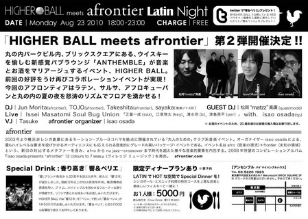 管理人様、告知失礼致します。 Higher Ball meets afrontier Latin Night 2010年8月23日(月) 18:00〜23:00 Charge Free!! 「ANTHEMBLE by My Humble House」 東京都千代田区丸の内2-6-1 丸の内パークビル Marunouchi BRICK SQUARE 3F 03-5220-1923 人気クラブジャズイベント、afrontierとのコラボレーションイベント第二弾! 今回は、ラテン、サルサ、アフロキューバンをテーマに、怒涛のリズムで丸の内の真夏の夜を熱く湧かせる!」 豪快なブロウが定評のサックス奏者Issei Masatomiが2010年新たに結成した「Soul Bag Union」