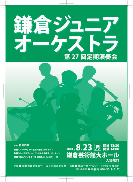 鎌倉ジュニアオーケストラのオケママスタッフをやっています。 この場をお借りして第27回鎌倉ジュニアオーケストラ定期演奏会の お知らせをさせていただきます。 鎌倉ジュニアオーケストラでは、 小3〜高3までの音楽好きな団員たちが、 この定期演奏会のために、今、一生懸命練習しています。 (写真右は8/12の合奏練習風景です) 本番へ向けての緊張感とワクワク感の高まりが 日に日に強く、子どもたちから伝わってきます。 なお、鎌倉ジュニアオーケストラでは随時団員を募集しています。 入団をご検討の方は、まずはお子さまと一
