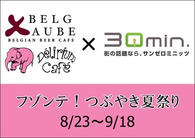 ども、コミュ管理人のとぉ〜〜るです。 コミュ主催のイベントと言うわけではないのですが、いつもコミュのイベントでお世話になっているデリリウムカフェさんとタウン情報サイトの30min.(サンゼロミニッツ)さんのコラボイベントのご紹介です。 ■日時 イベントの期間 8/23〜9/18(デリリムカフェ、ベルオーブ各店) 懇親会 8/23 20時より(デリリムカフェ霞が関) ■趣旨 期間内にお店で飲みながらtwitterでつぶやいて特別なビールを飲んだり、素敵なグッズをもらったりしようって趣旨のイベントのようです。 (twitterを利用するイベン