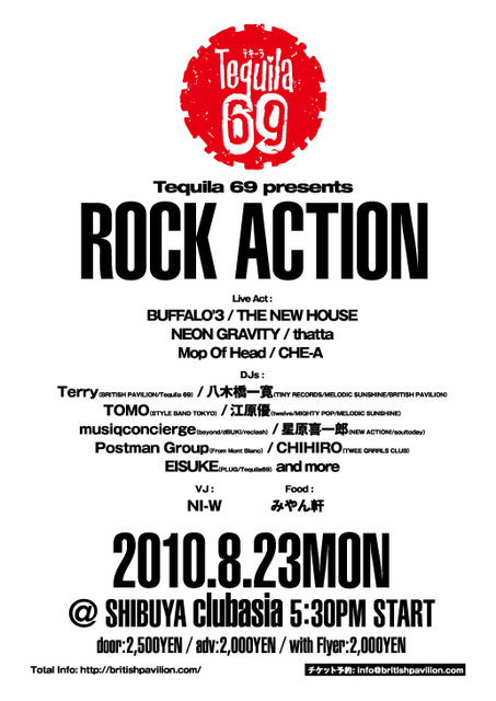 -Tequila69 presents- ROCK ACTION vol.8 8月23日(月) @clubasia 17:30 open/start Door:2500yen(D別) / Adv:2000yen(D別) Live: BUFFALO'3 THE NEW HOUSE NEON GRAVITY thatta Mop Of Head CHE-A Djs: Terry(BRITISH PAVILION/Tequila69) 八木橋一寛(TINY RECORDS/MELODIC SUNSHINE/BRITISH PAVILION) TOMO(STYLE BAND TOKYO) 江原優(twelve/MIGHTY POP/MELODIC SUNSHINE) musiqconcierge(beyond/dBUKi/reclash) 星原喜一郎(NEW ACTION!/soultoday) Postman Group(From Mont Blanc) CHIHIRO(TWEE GRRRLS CLUB)
