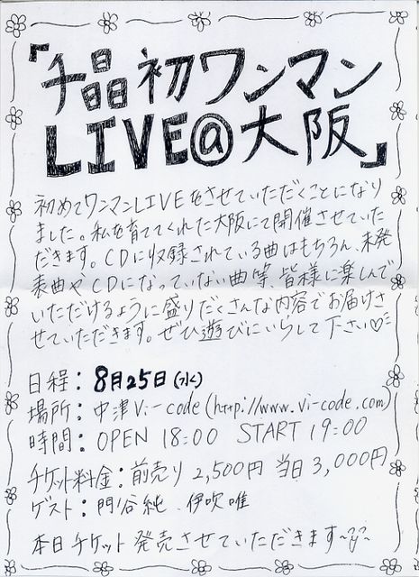 20100825「Chiaki's Birthday Night in Osaka」 …… 「千晶初ワンマンライブ@大阪」 日程:2010.8.25(水) 会場:中津Vi-code →地図http://www.vi-code.com/img/map_vicode.gif Open:18:00 Start:19:00 Ticket:Adv. 2,500 /Door 3,000 (+1d) Guests:門谷純、伊吹唯 千晶初のワンマンライブが本人2x歳のBirthday(曰く永遠の20歳)の8/25に行われます。 平日という大阪近辺の方以外には非常に参加しづらい日程ではありますが、ふるってご参加いただけると嬉しいです。 ファン企画は……。このイベントトピックでやっ