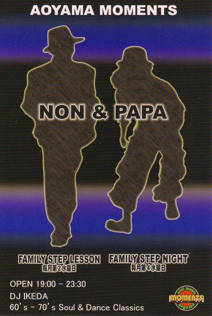 定例の「青山 NON&PAPA Family Step Lesson」 のお知らせです♪ 8月も終わりに近づきましたが、 まだまだ暑い日が続いています でも夜は涼しくなるでしょうから、 今回も楽しく踊りましょう!! 場所 青山 club moments 日時 8月 25日(水) イベント NON&PAPA Family Step Lesson open19:30〜23:30 ☆〜 DJ IKEDA ※70sSoul / Step Lesson EVENT 守屋PAPAが懇切丁寧に[Step Lesson]致します♪ 初心者の方も毎回多く、 アットホ