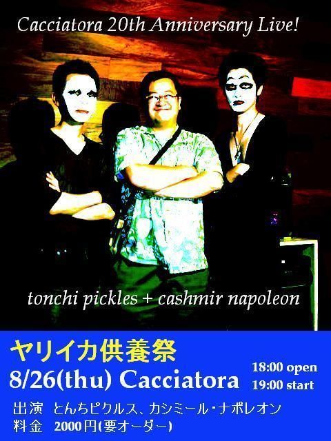 久しぶりのフルバンド(2人)です!ヤリイカ供養祭とのことですので、 ヤリイカ達へ僕らなりのレクイエムを捧げたいと思います。 「今年20周年を迎える恵比寿のイタリアンレストランバー、カチャトラで お祝いライブをします。東京に行くたび必ずここに寄り、ヤリイカのグ リーンペパーソーススパゲティを食べてます。この日は一年間食べて きたヤリイカに感謝し、その魂を鎮める供養祭です。そしてカシミール・ ナポレオンも登場!!」 (とんちピクルス松浦氏) Cacciatora 20th Anniversary Live! 「ヤリイカ供養祭」 [料金] 2000円