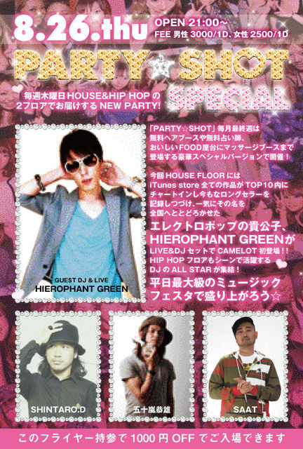 渋谷camelotの新パーティー開催!! 『PARTY☆SHOT』 タイトル通り毎週パーティーショットを撮って、次回のフライヤーやWEBにUPしちゃいます オールジャンルでメインフロアーで開催します 木曜日ですが,アパレル系や業界系などで方で大いに盛り上がっています アットホームな空間でたくさんの人と交流をもて,人脈作りにも最適です GUEST DJ HIEROPHANT GREENが登場 mixi特典としてDiscountサービスを行っていますので、ぜひともご利用ください
