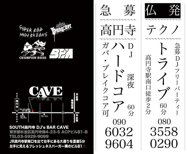 告知失礼致します。 Superbad MIDI Breaks結成8周年を記念して、フリーパーティーを行います。 場所は高円寺に昨年OPENしたばかりの DJ's BAR CAVE with KILL ALL HIPPIES SOUNDSYSTEMです。 22:00 START 入場無料 with 1ドリンク 再入場可です。 東京屈指のリアルハードコアパーティーへ、是非足を運んでみてください。 「KILL ALL HIPPIES」 Superbad MIDI Breaks 8th Anniversary Bash!! 2010/8/27 (FRI) @ 高円寺 DJ's BAR CAVE 22:00 OPEN 入場無料 with 1ドリンク 再入場可 ■DJ's ・村木幸星 (Superbad MIDI Breaks) ・