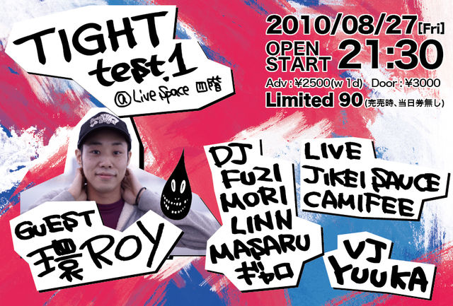 2010.08.27(fri) @ Live Space【四階】 前売 \2500(1 drink) 当日 \3000(without drink) 限定90枚(完売時、当日券無し) OPEN/START21:30〜 GUEST LIVE 環ROY DJ FUZI MORI LINN MASARU ギャロ LIVE JIKEI SAUCE CAMIFEE VJ YUUKA