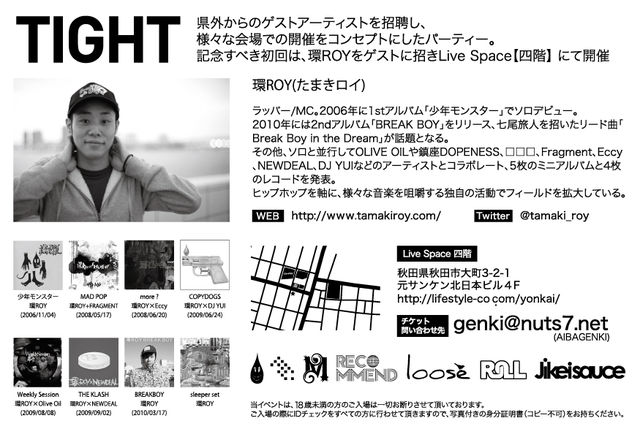 ラッパーでおなじみ あの環ROYが秋田にやってきます! TIGHT test.1 2010.08.27(fri) @ Live Space【四階】 前売 \2500(1 drink) 当日 \3000(without drink) 限定90枚(完売時、当日券無し) OPEN/START21:30 GUEST LIVE 環ROY プロフィール 環ROY(たまきロイ) ラッパー/MC。2006年に1stアルバム「少年モンスター」でソロデビュー。 2010年には2ndアルバム「BREAK BOY」をリリース、七尾旅人を招いたリード曲 「Break Boy in the Dream」が話題となる。 その他、ソロと並行してOLIVE OILや鎮座DOPENESS、□□□、Fragment、Eccy