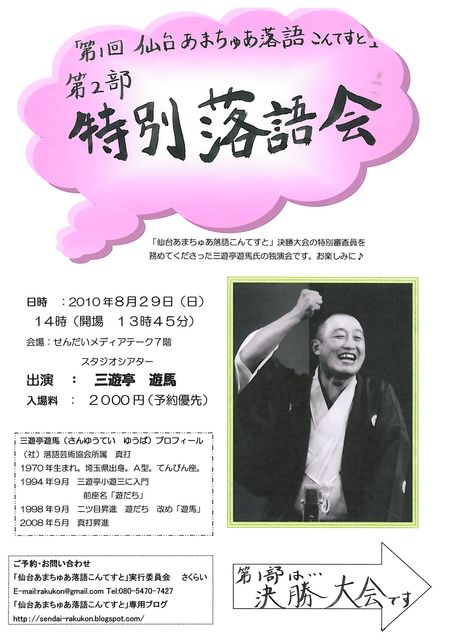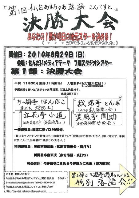 こんにちは 仙台初(?!)客席参加型落語会 「第1回 仙台あまちゅあ落語こんてすと」開催します! 2010年8月29日(日) せんだいメディアテーク 7階 スタジオシアター 午前11時30分より「決勝大会」 ※4月&6月の予選を勝ち抜いた「アマチュア落語家」4名の頂上決戦です。 観に来ていただいた皆様の投票で優勝者を決定します。 落語を聴くのが初めての方、落語に興味のあるお子様も大歓迎です! ぜひ、気軽に観に来てください! ※入場無料です。(全くの手弁当開催につき「投げ銭」(=