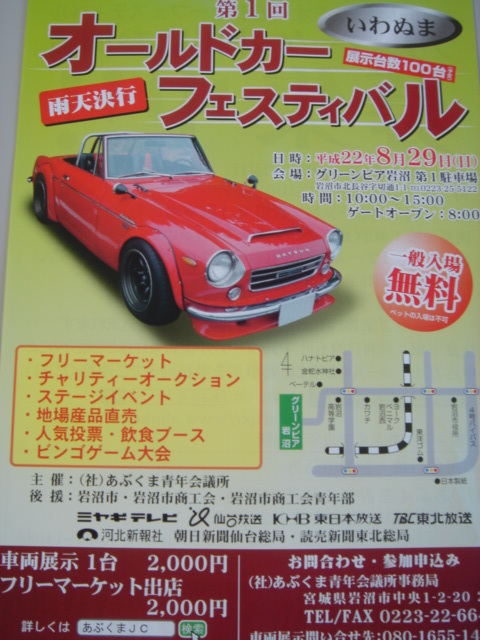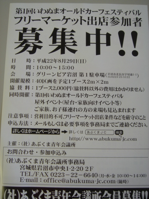 岩沼で「オールドカーフェスティバル」を開催いたします。 同時に、フリーマーケットも開催することになりましたのでご参加お待ちしております。 開催日時:2010年8月29日(日曜) 時 間:10時〜15時 場 所:グリーンピア岩沼 出店料 :2000円 詳しくはHPをご覧下さい。 http://www.geocities.jp/abukumajc/