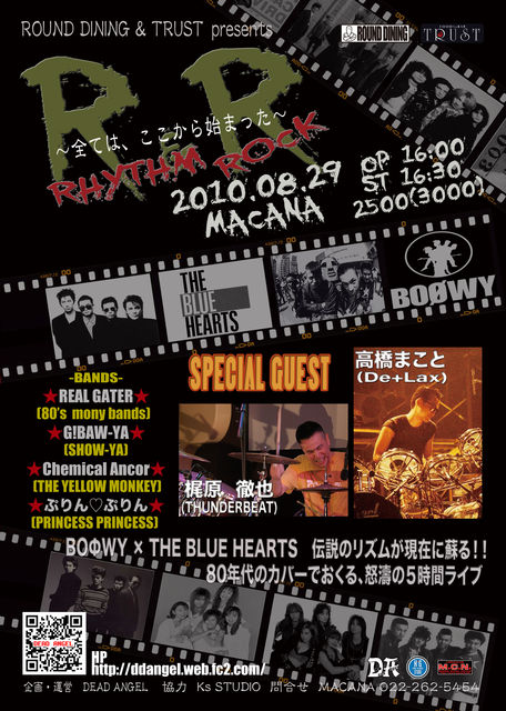いよいよ、明日MACANAに乗り込みます。 80年代〜現代の日本の音楽シーンに影響を及ぼしたロック・バンドが数多く誕生した。 そんな時代を走り続けたカリスマ的存在バンド「BOOWY」「THE BLUE HEARTS」 のドラマー「高橋まこと」「梶原徹也」をゲストに迎えて贈る80年代バンド限定イベント 当日は「高橋まことさん」参加でBOOWY, 「梶原徹也さん」参加でTHE BLUE HEARTSのコピーバンドも出演が決定。 5時間にわたって、日本のロックの歴史を振り返るこの夏 最大の暑い ROUND DINING & TRUST presents リズム&ロック〜全ては、こ