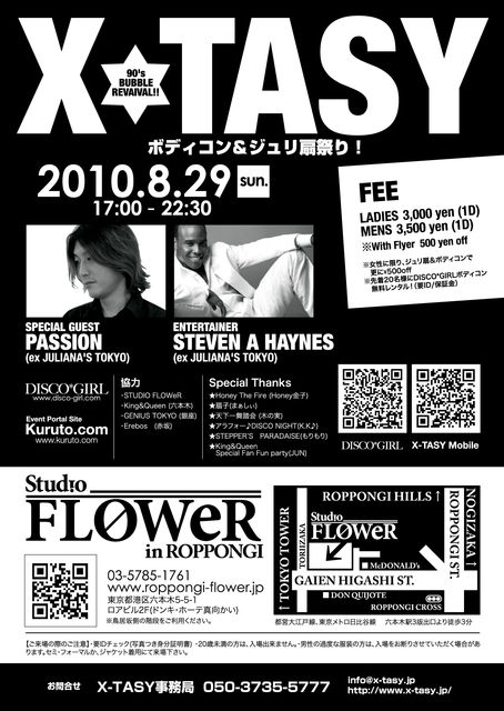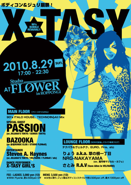 <8/29(日)ボディコン&ジュリ扇祭 り!@X-TASY> 今回の夏も、ボディコン&ジュリ扇の女性が、メインフロアでバトル! 夏のX-TASYと言う事で、水着参加も可能です♪ メインフロアでは、DJ PASSIONのサウンドプロデュースと、スティーブン&X-TASY GIRL’Sのダンスパフォーマによる、熱いバトルによって、90年代のジュリテクをPleyして当時の芝浦DISCOの雰囲気を再現! パラパラ専用フロアでは、元高円寺マジカル・カフェのDJ NRG-NAKAYAMAを招いて、ファイヤー・タイムをプロデュース! 他、DJ さとみも加わり、DJ りょう a.k.a.