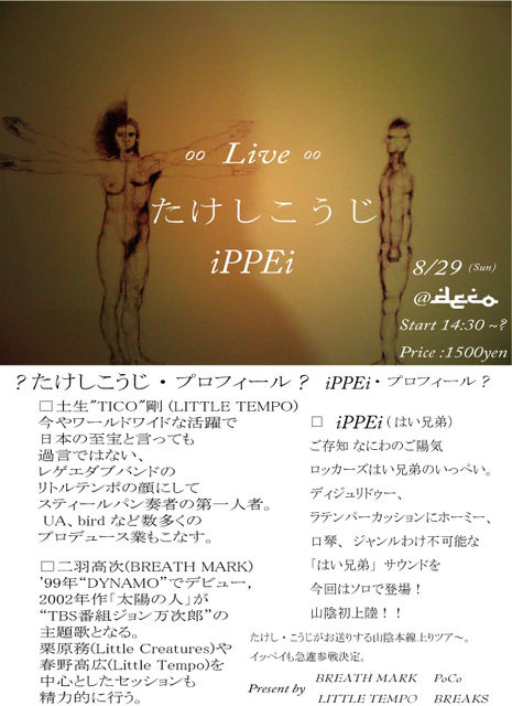 8月の締めに相応しく ポ。コ。+ ブレイクス企画 たけし・こうじ山陰本線上りツア〜 に、、、 iPPEi<はい兄弟>が参戦決定!! チケットは30枚限定とさせていただきます。 なにはともあれ皆様のお越しをお待ちしております。 ?たけし・こうじ? □土生"TICO"剛 (LITTLE TEMPO) 今やワールドワイドな活躍で 日本の至宝と言っても過言ではない、 レゲエダブバンドのリトルテンポの顔にして スティールパン奏者の第一人者。 UA、bird など数多くのプロデュース業もこなす。 □二羽高次(BREATH MARK) '99年“DY